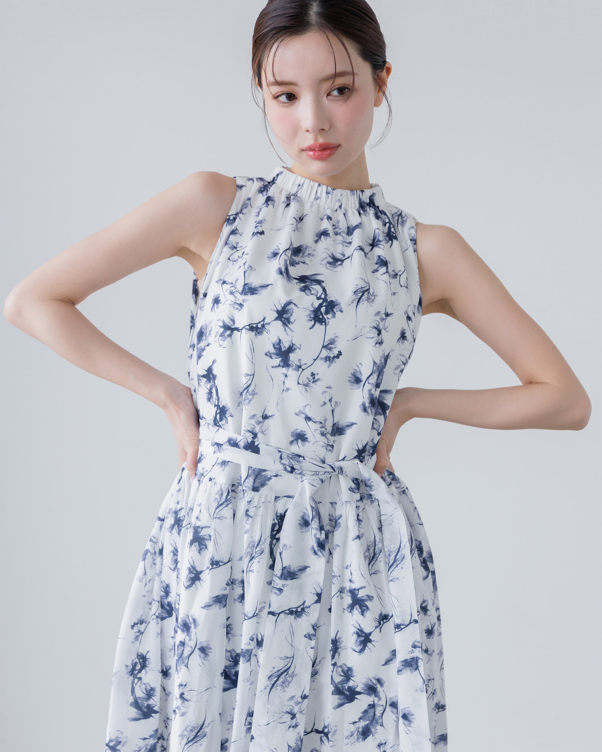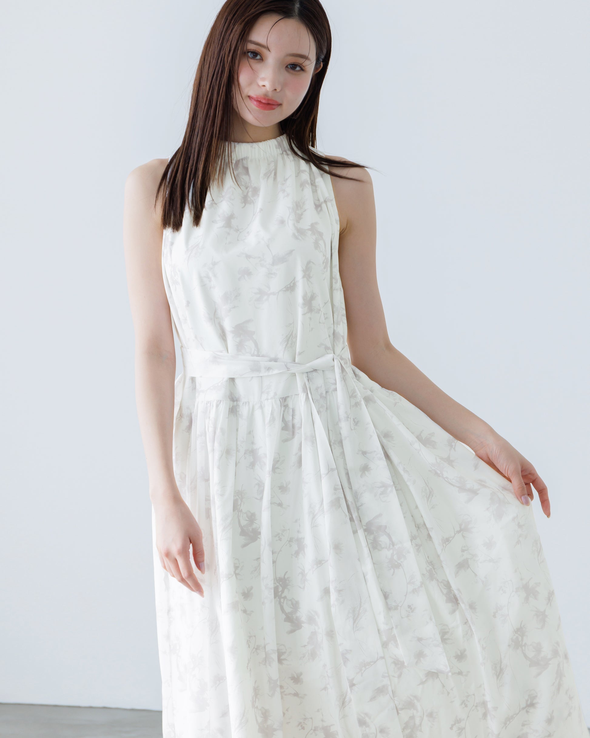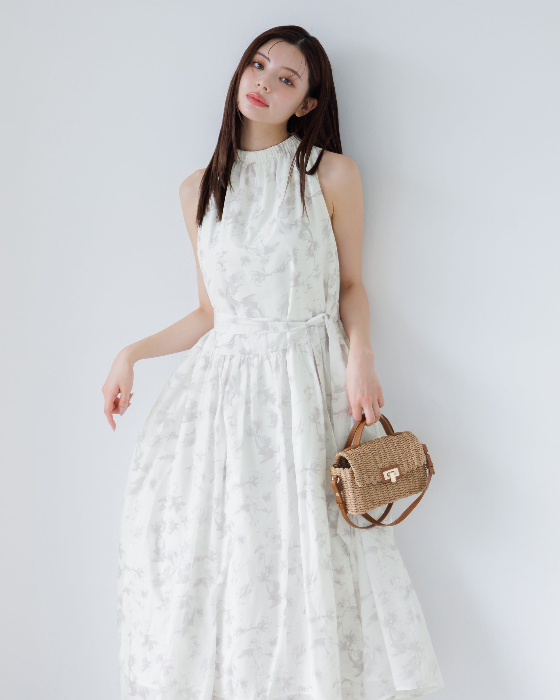 ホルターネックがデコルテをすっきりと見せてくれる、フラワーワンピース。