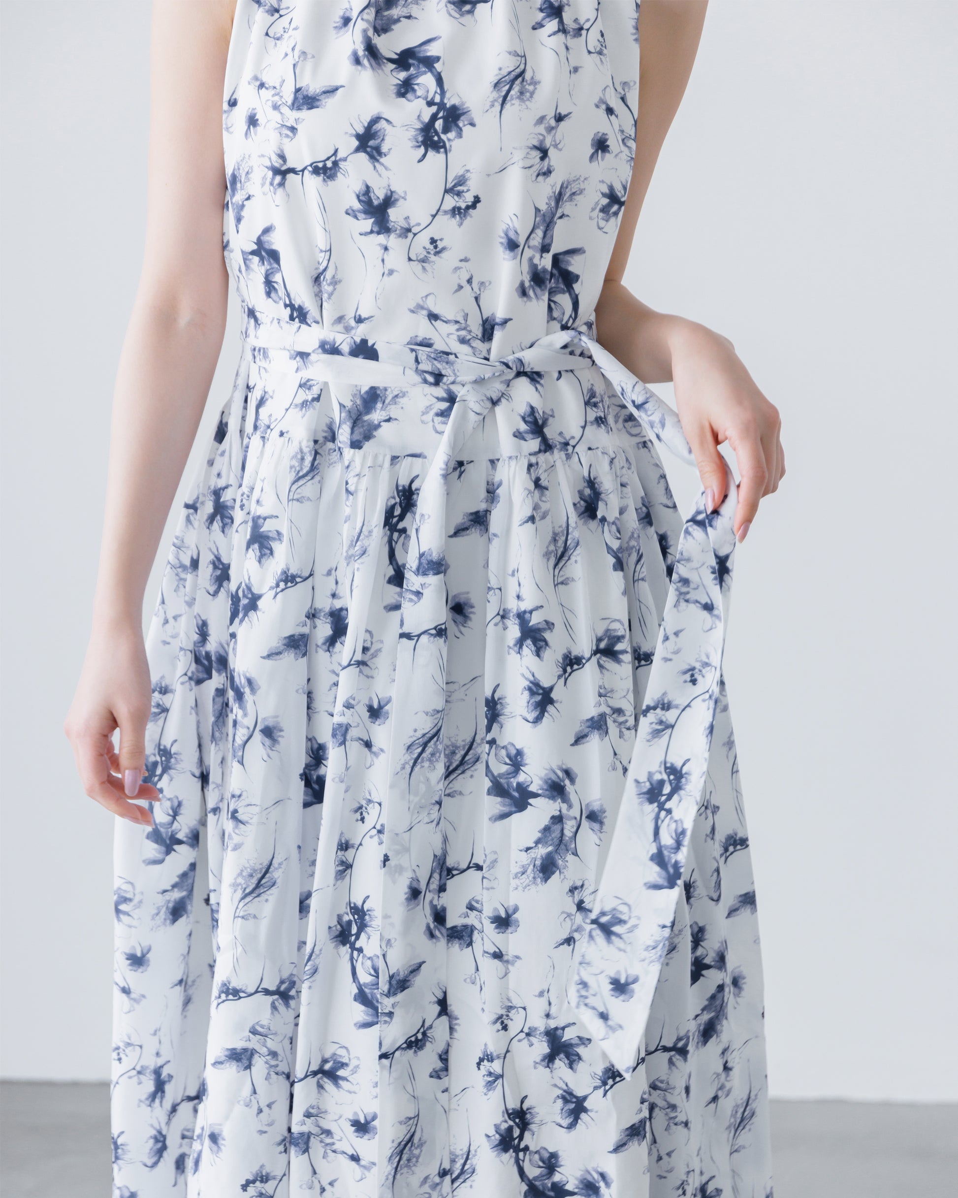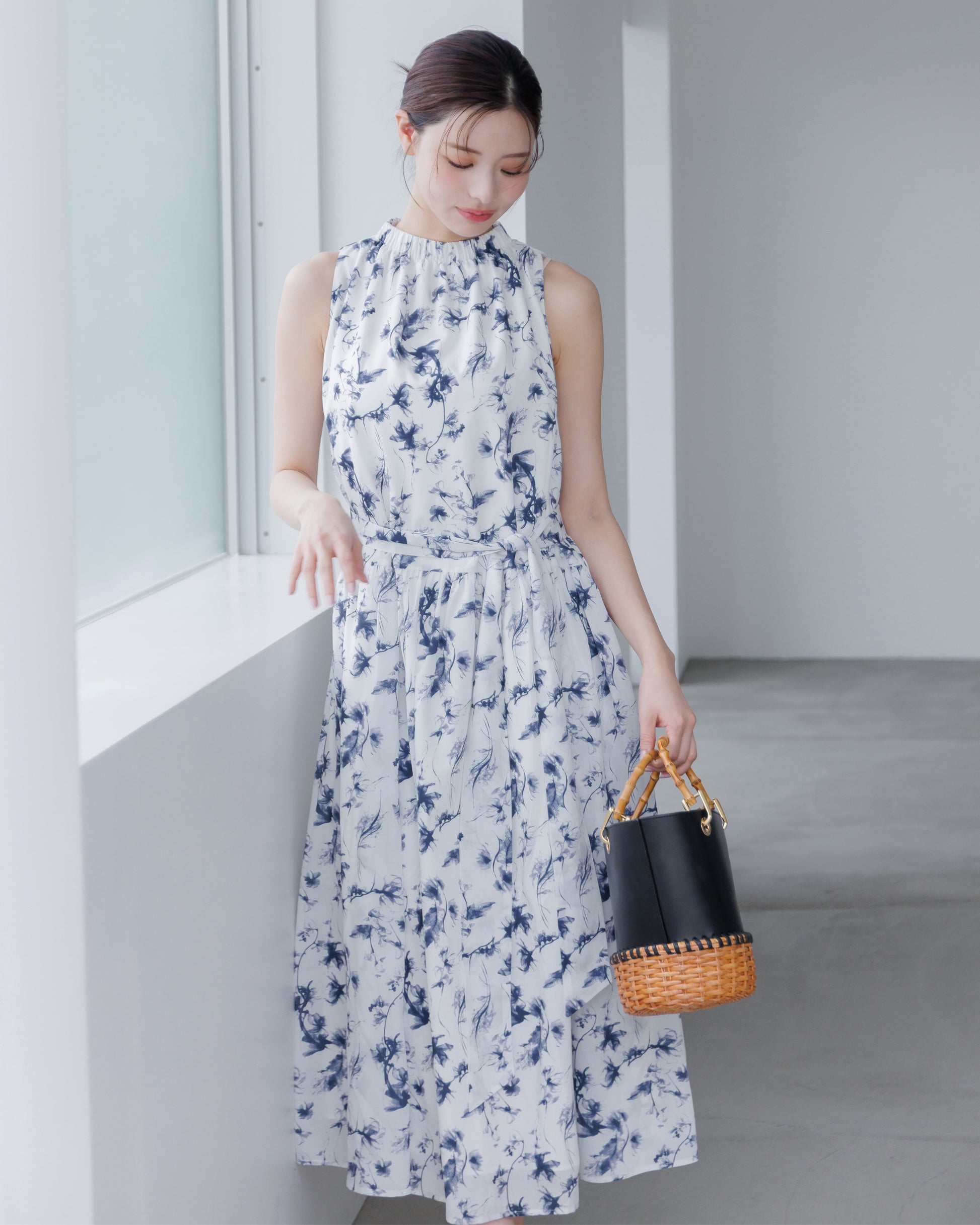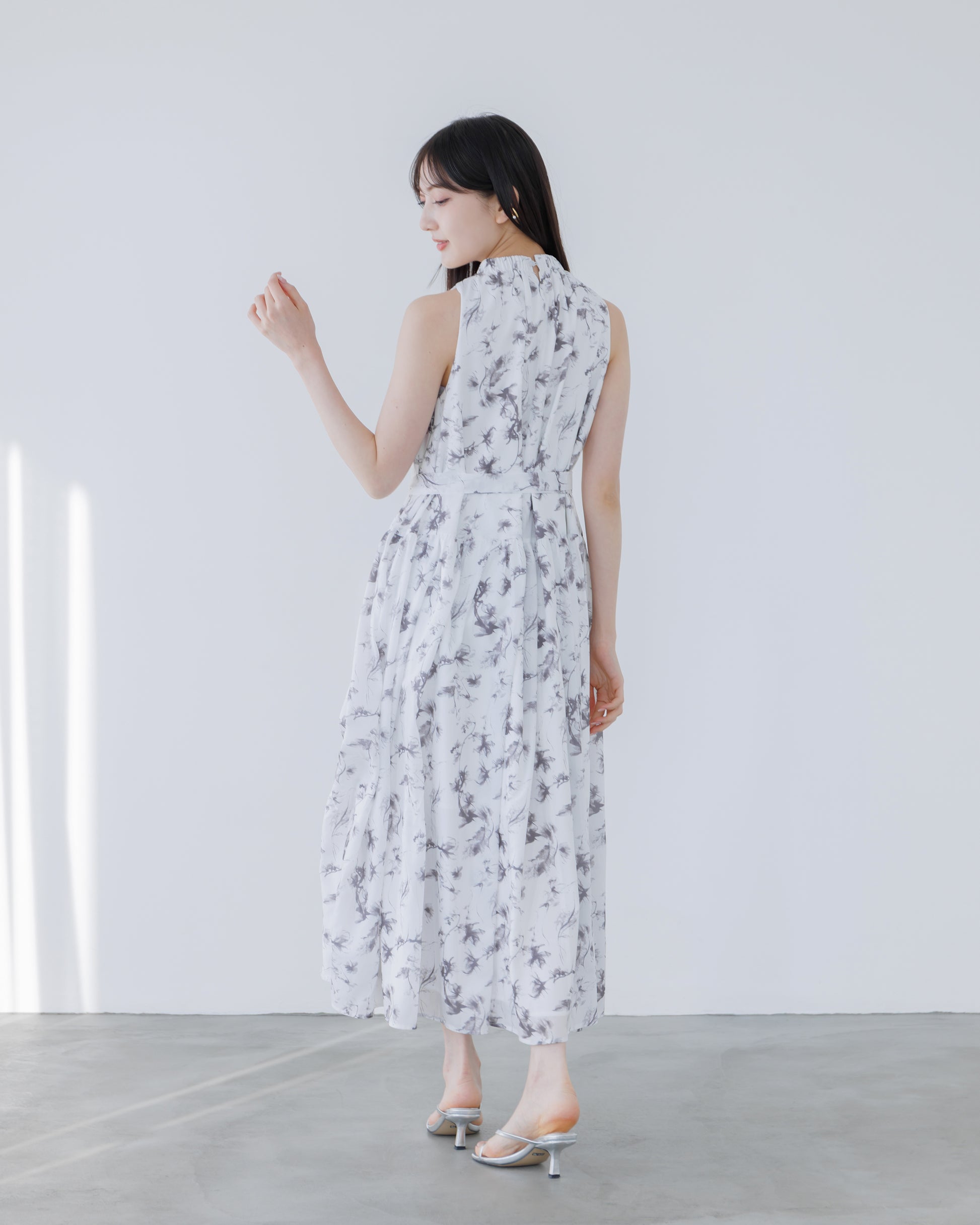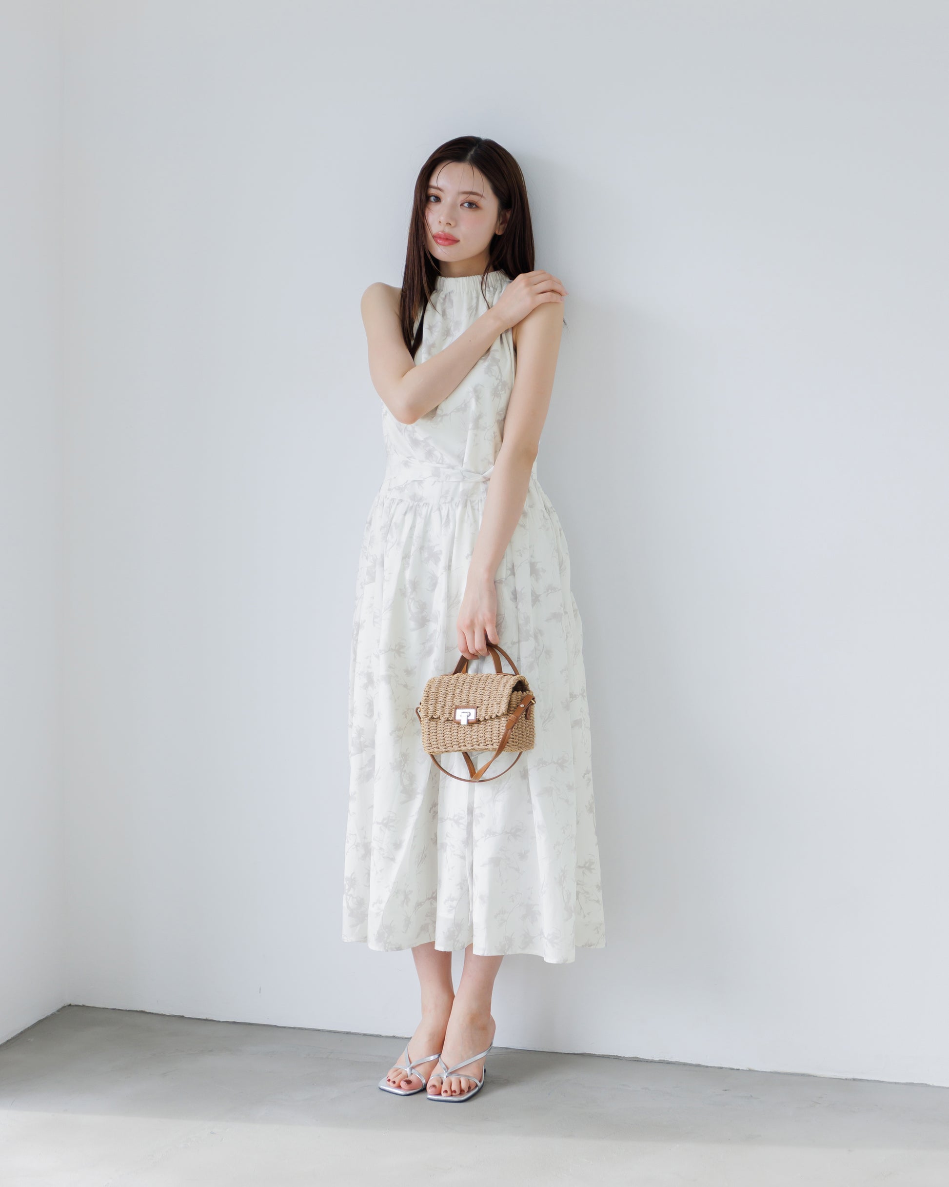 ホルターネックがデコルテをすっきりと見せてくれる、フラワーワンピース。