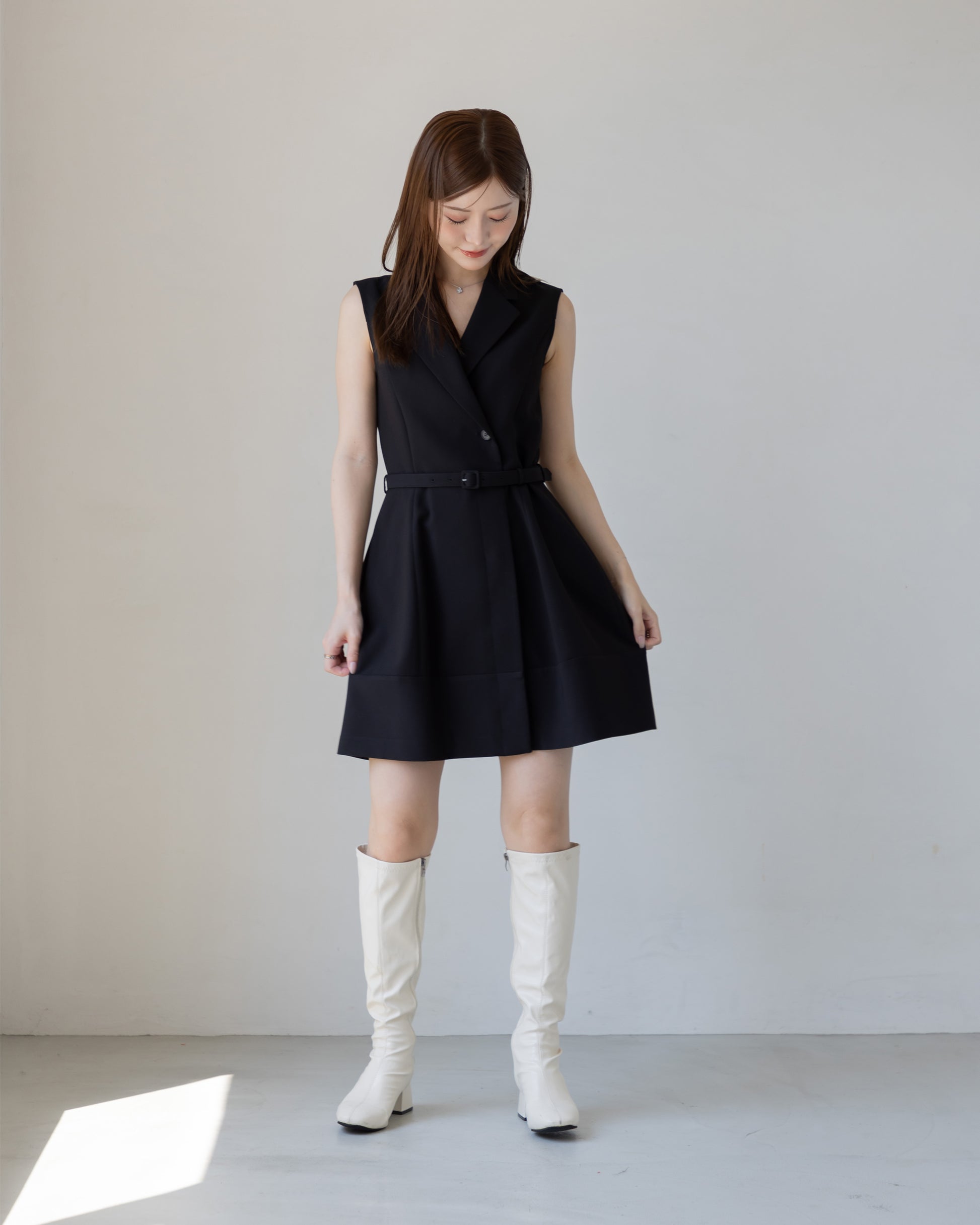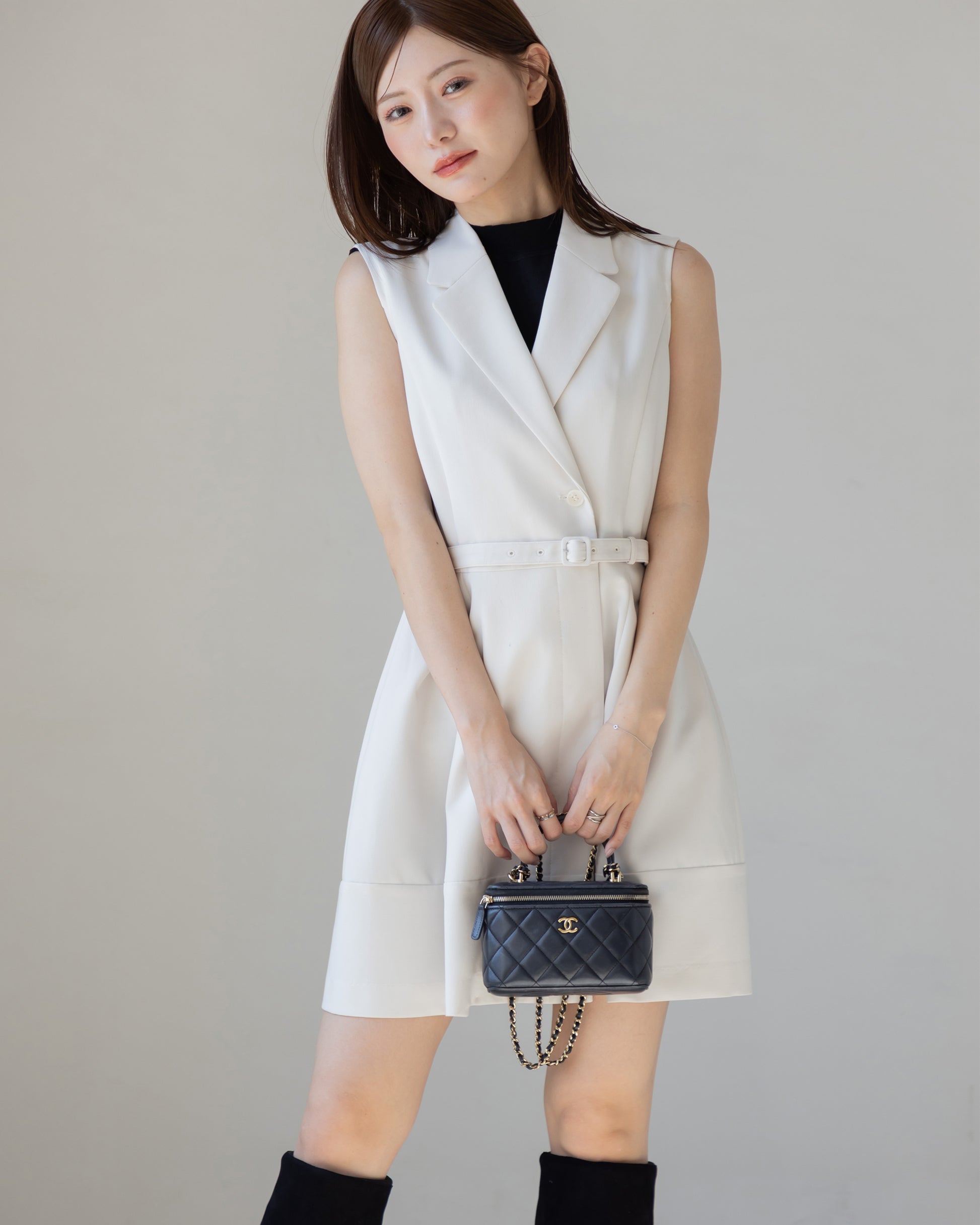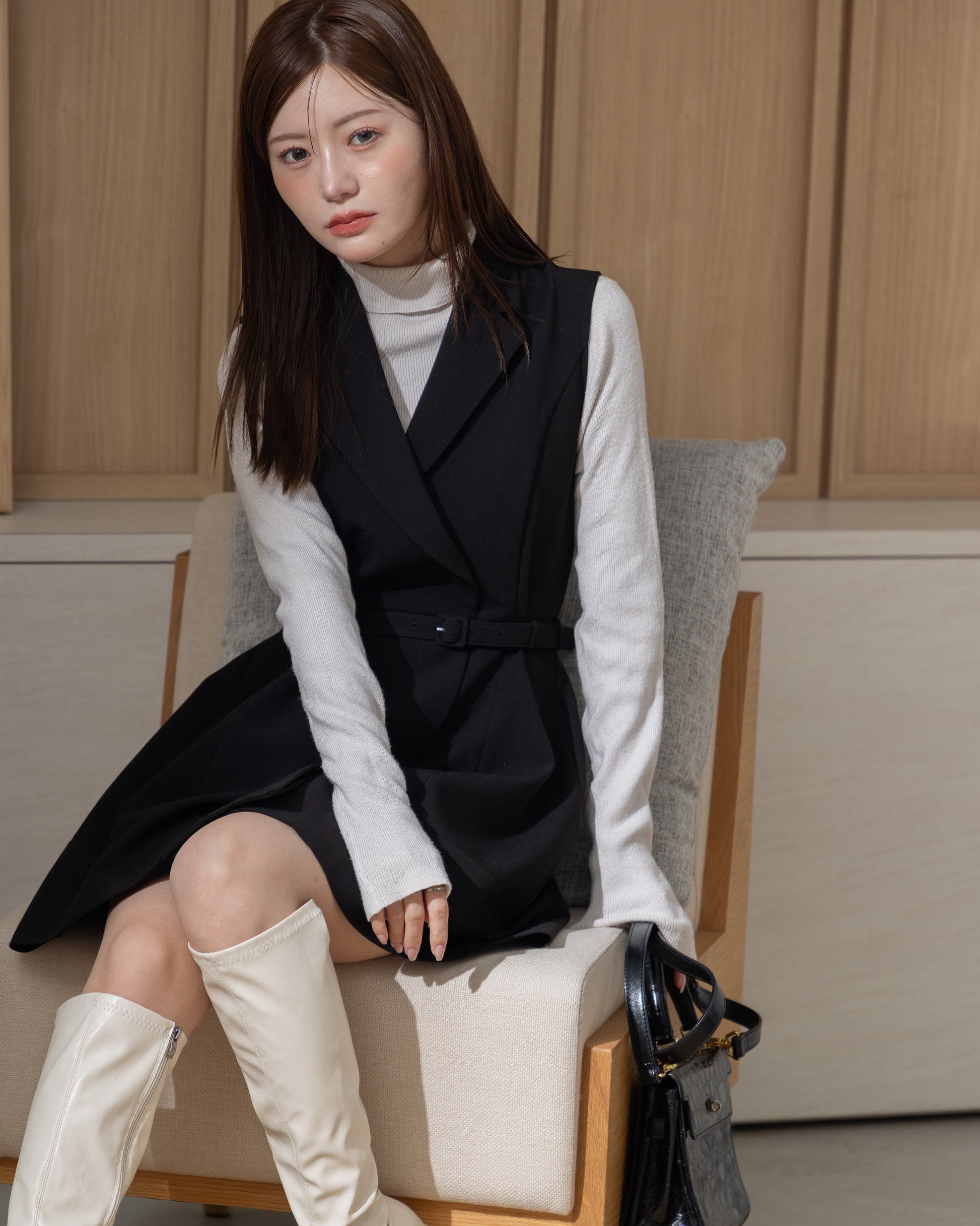 ジレ風にもアレンジできるので使い勝手がよく、どんなシーンでも着用できます!秋冬はロングブーツと合わせるのがおすすめ。